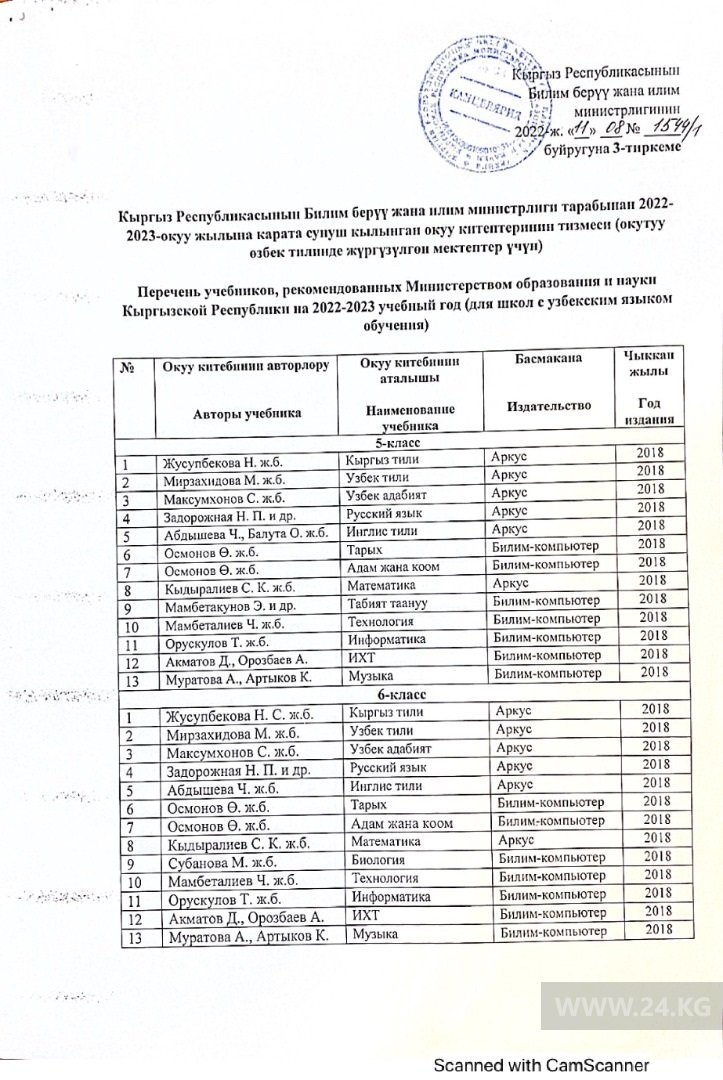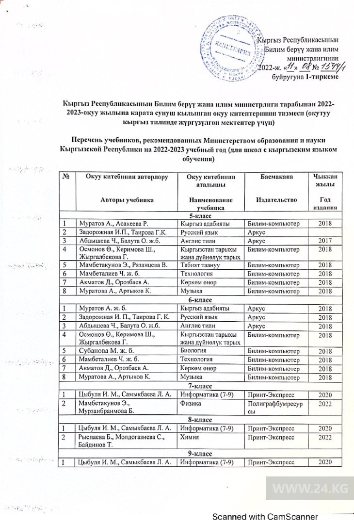 В списке для 5-х классов в школах с русским языком обучения 10 учебников: по русскому языку и русской литературе, английскому, истории Кыргызстана и мировой истории, естествознанию, технологии, музыке, математике, ИХТ, информатике. В 6-х классах таких школ девять учебников: по русскому языку и русской литературе, английскому, истории Кыргызстана и мировой истории, биологии, технологии, музыке, ИХТ, информатике. В 7-9-х классах в аренду дают только учебник по информатике.