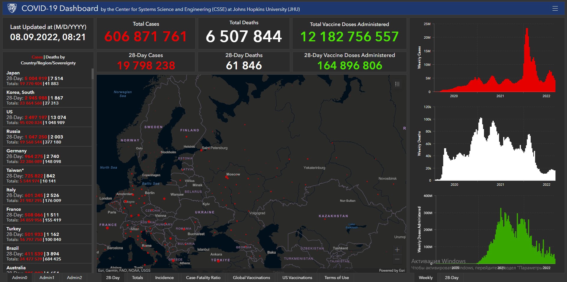 Всего в мире с начала пандемии коронавирусом заразились 606 миллионов 871 тысяча 761 человек. Больше всего в США (95 миллионов 20 тысяч 834), Индии (44 миллиона 469 тысяч 661), Бразилии (34 миллиона 477 тысяч 539), Франции (34 миллиона 859 тысяч 956), Великобритании (23 миллиона 738 тысяч 784), России (19 миллионов 568 тысяч 544), Турции (16 миллионов 797 тысяч 750), Аргентине (9 миллионов 689 тысяч 861), Иране (7 миллионов 536 тысяч 217), Колумбии (6 миллионов 302 тысячи 809), Испании (13 миллионов 358 тысяч 722), Италии (21 миллион 987 тысяч 295) и Германии (32 миллиона 386 тысяч 89).