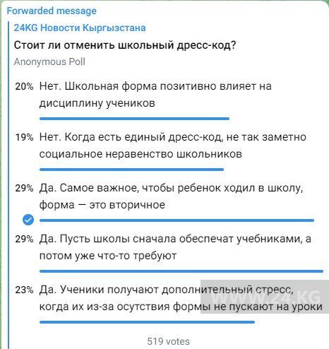 В Telegram-канале тоже большинство — более 80 процентов проголосовавших — за отмену школьной формы.
