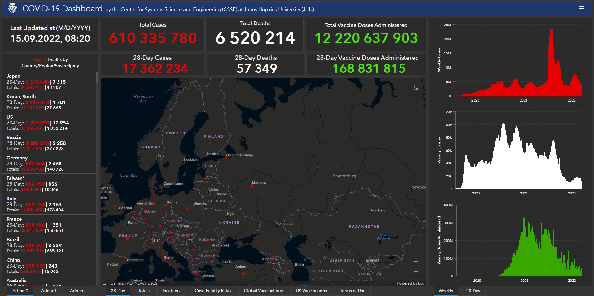 Всего в мире с начала пандемии коронавирусом заразились 610 миллионов 335 тысяч 780 человек. Больше всего в США (95 миллионов 490 тысяч 495), Индии (44 миллиона 507 тысяч 471), Бразилии (34 миллиона 558 тысяч 902), Франции (35 миллионов 15 тысяч 24), Великобритании (23 миллиона 772 тысячи 20), России (19 миллионов 915 тысяч 400), Турции (16 миллионов 852 тысячи 382), Аргентине (9 миллионов 697 тысяч 763), Иране (7 миллионов 540 тысяч 962), Колумбии (6 миллионов 304 тысячи 317), Испании (13 миллионов 374 тысячи 116), Италии (22 миллиона 96 тысяч 450) и Германии (32 миллиона 604 тысячи 993).