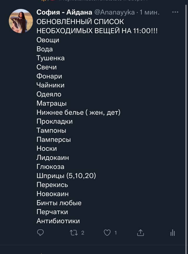 Волонтеры обновили список необходимых продуктов и вещей для помощи пострадавшим жителям Баткенской области. Об этом в своем Twitter написала София-Айдана Мурзаева.
