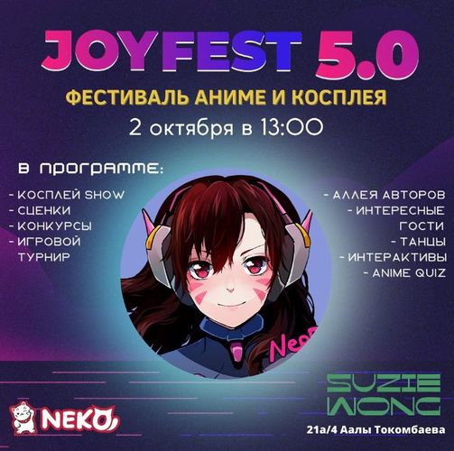 Фестиваль для любителей гик-культуры (аниме, комиксы, игры, мультики). В программе косплей-шоу, конкурсы, сценки, неоновое шоу, аллея авторов, танцы, зона игр, презентации и многое другое.