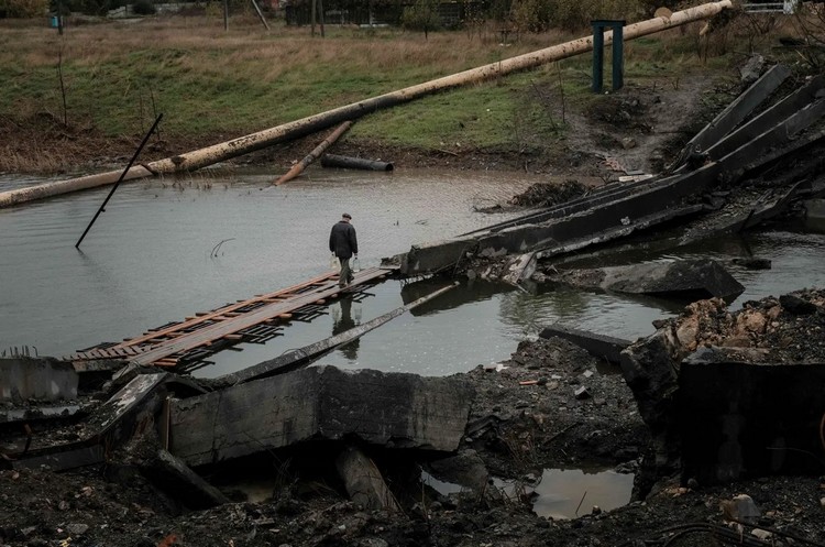 Фото Yasuyoshi Chiba/AFP/Scanpix/LETA. Житель Бахмута идет по мосту, разрушенному во время боевых действий
