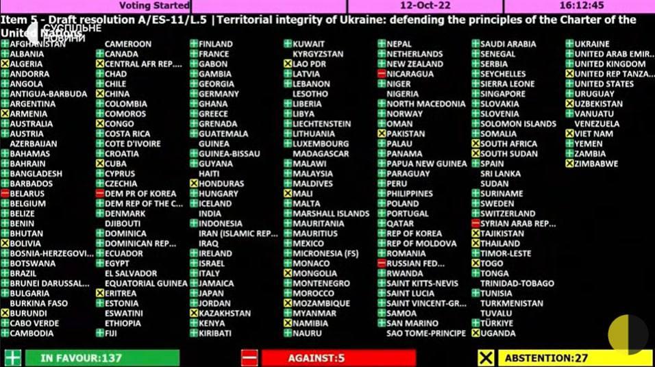 Генеральная ассамблея ООН приняла резолюцию, не признающую референдумы в ДНР, ЛНР, Херсонской и Запорожской областях.