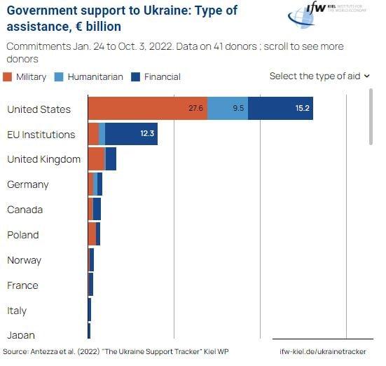 Наиболее крупным донором Украины являются США, общая сумма обязательств их помощи составляет 52,3 миллиарда евро.