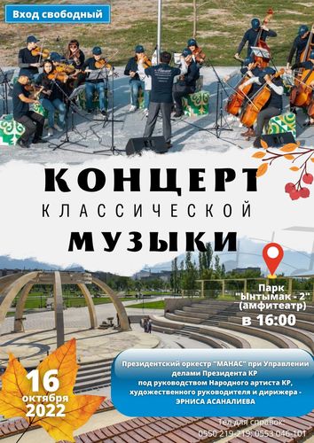 В рамках благотворительных концертов президентский оркестр «Манас» под руководством народного артиста КР, художественного руководителя и дирижера Эрниса Асаналиева приглашает жителей и гостей столицы насладиться классической музыкой. Подробнее