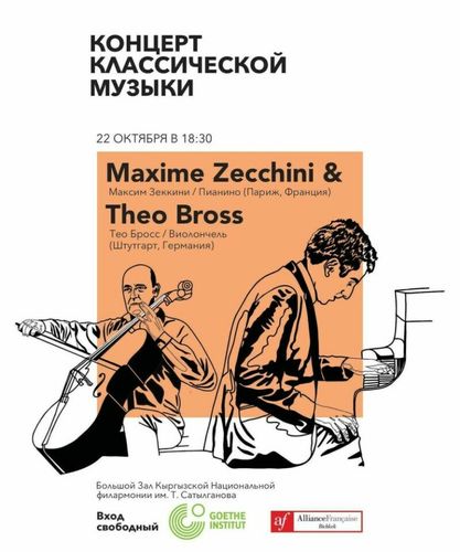 Выступят музыканты с мировым именем, неоднократные победители и лауреаты международных конкурсов — виолончелист Тео Бросс (Штутгарт, Германия) и пианист Максим Зеккини (Париж, Франция).