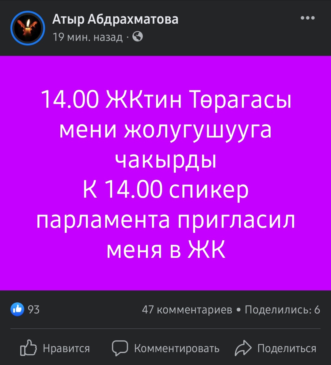 Омбудсмена Кыргызстана пригласил спикер Жогорку Кенеша Нурланбек Шакиев. Об этом она написала на своей странице в Facebook.