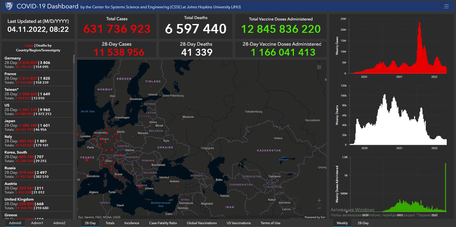 Всего в мире с начала пандемии коронавирусом заразились 631 миллион 736 тысяч 923 человека. Больше всего в США (97 миллионов 689 тысяч 925), Индии (44 миллиона 655 тысяч 926), Бразилии (34 миллиона 846 тысяч 308), Франции (37 миллионов 110 тысяч 800), Великобритании (24 миллиона 154 тысячи 796), России (21 миллион 142 тысячи 507), Турции (16 миллионов 919 тысяч 638), Аргентине (9 миллионов 718 тысяч 875), Иране (7 миллионов 557 тысяч 962), Колумбии (6 миллионов 310 тысяч 332), Испании (13 миллионов 511 тысяч 768), Италии (23 миллиона 531 тысяча 23) и Германии (35 миллионов 728 тысяч 277).