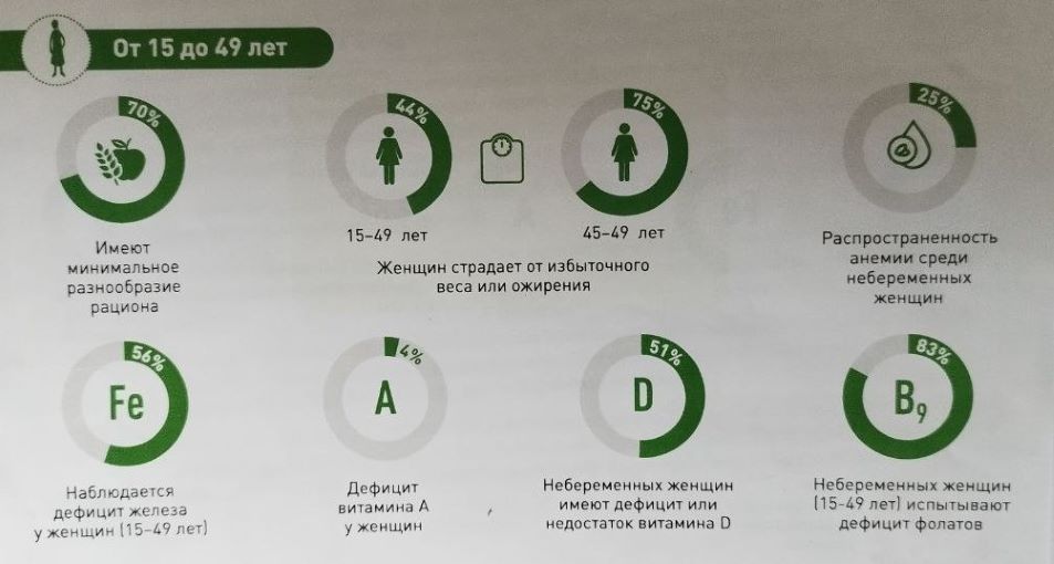 У взрослых проблем не меньше. Почти половина беременных в Кыргызстане страдает анемией, что повышает риск материнской и неонатальной смертности, преждевременных родов и задержки развития ребенка.Подавляющее большинство женщин и девочек-подростков — 86 процентов — страдают дефицитом фолиевой кислоты.
