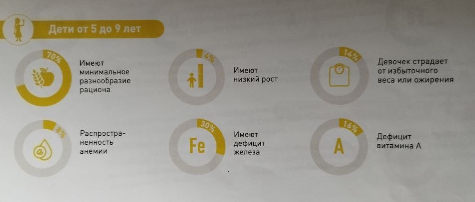 В Бишкеке презентовали результаты первого национального комплексного исследования состояния питания детей и женщин. Анализ выявил тревожный уровень анемии, дефицита железа и фолиевой кислоты, нехватку витаминов А и D. Дети имеют низкий рост или, напротив, как и взрослые, страдают от ожирения.«Дефицит железа, например, особенно опасен в первые пять лет жизни. Именно в этом возрасте происходит формирование головного мозга, а соответственно, и когнитивное развитие, — рассказала журналистам доктор медицинских наук, профессор, специалист по питанию Турсун Мамырбаева. — От дефицита железа у ребенка будет страдать концентрация внимания, память, логическое мышление. Ясно, что такой ребенок на занятиях будет отставать в интеллектуальном развитии. Это будет проявляться в каких-то жизненных ситуациях». Восполнить эти пробелы позднее не получится, ведь головной мозг уже сформирован.