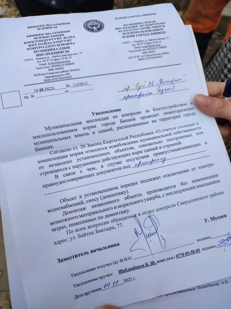 «Я считаю, что это откровенный беспредел. В 2019 году нам отказали в продолжении аренды и снесли пристройку, расположенную на проспекте Чуй. Мы оспорили отказ в суде. После вынесения решения в нашу пользу ДУМИ приезжает и начинает демонтаж», — сказала она.