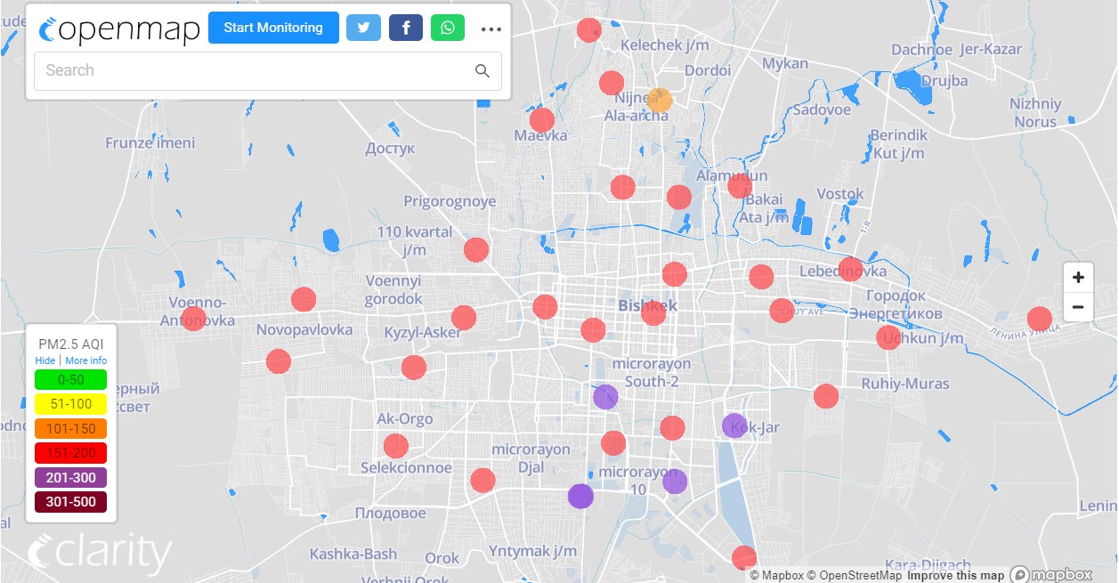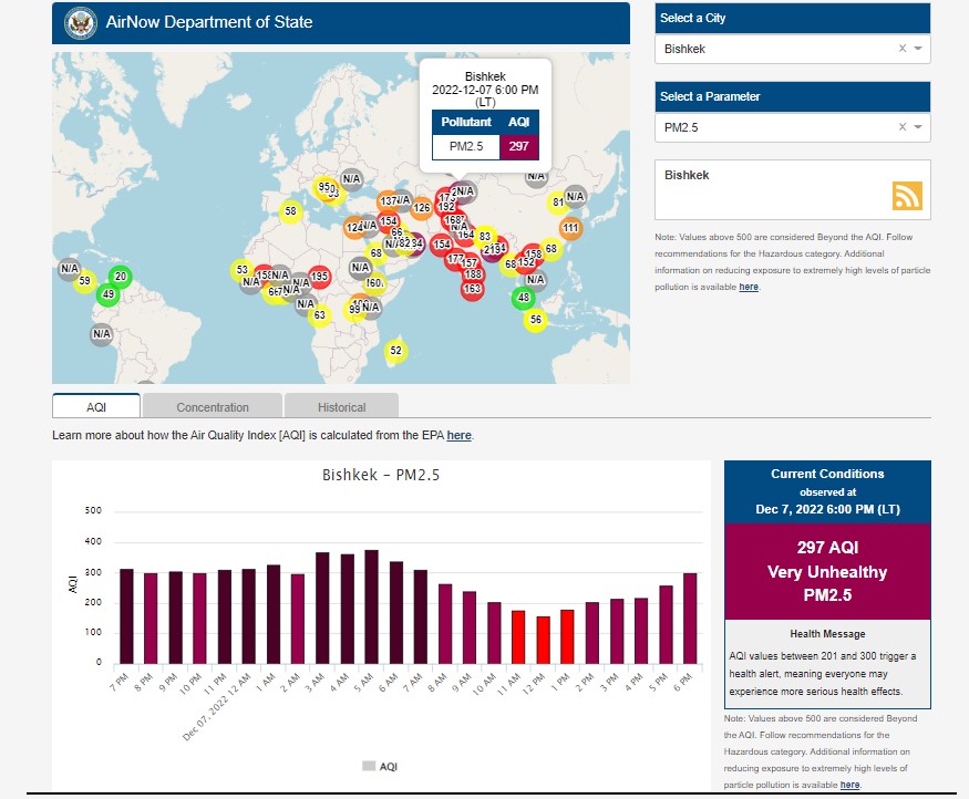 Посольство США в Кыргызстане также установило станцию. Информация обновляется каждый час. Индекс качества воздуха в районе дипломатической миссии «очень нездоровый» — 297 (AQI).