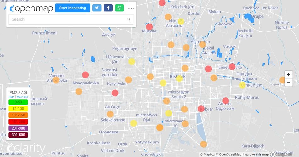 Посольство США в Кыргызстане также установило станцию. Информация обновляется каждый час. Индекс качества воздуха в районе дипломатической миссии «нездоровый» — 157 (AQI).