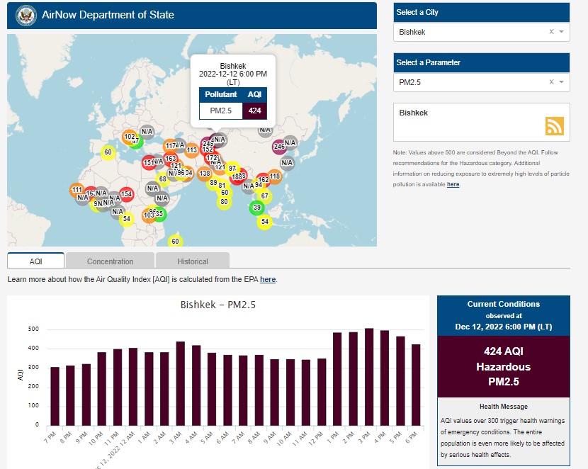 Посольство США в Кыргызстане также установило станцию. Информация обновляется каждый час. Индекс качества воздуха в районе дипломатической миссии «опасный» — 424 (AQI).