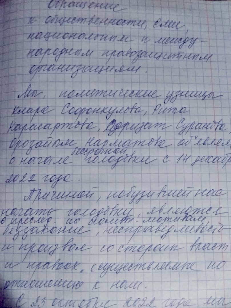Сегодня для нас, политических узниц Кыргызстана, единственным способом борьбы не только за свои права и свободы, но и в целом за демократические ценности и верховенство права остается объявление голодовки.