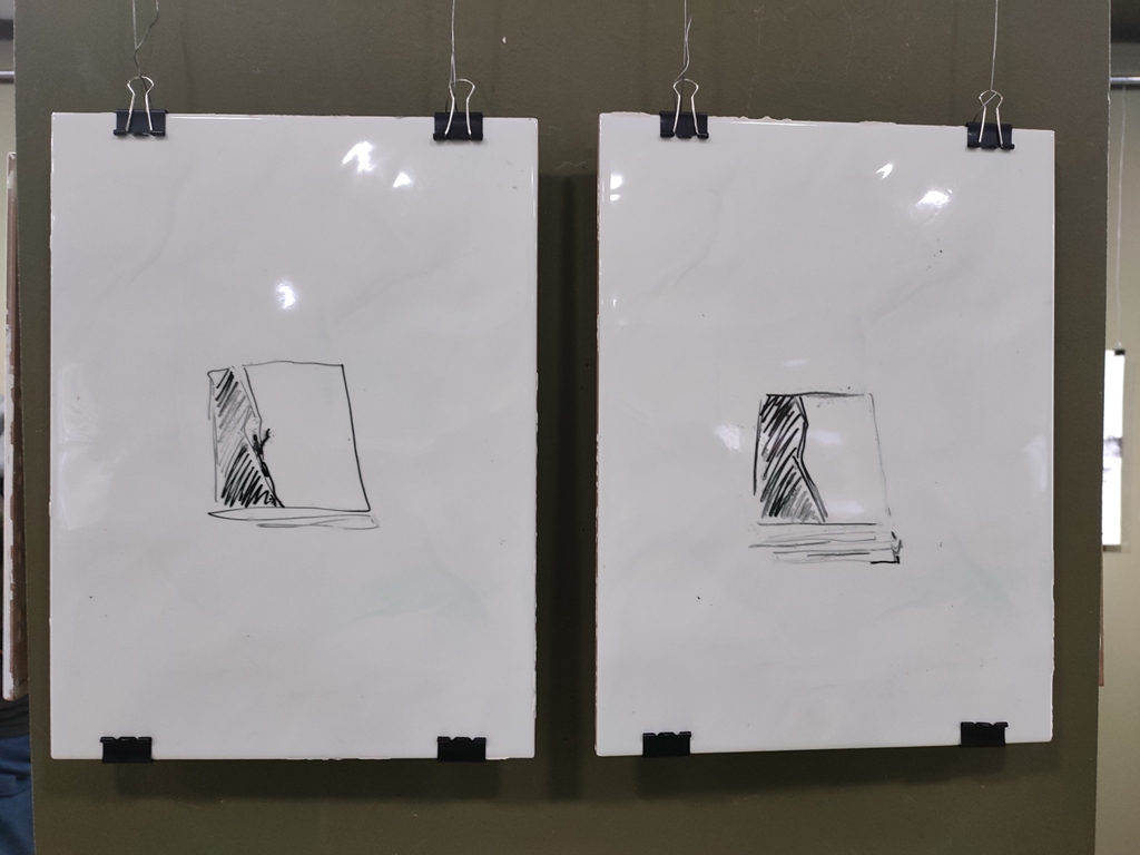 Рядом в зале иллюстрации «Монумент революциям», исполненные на кафельных плитках Уланом Джапаровым. В размытых силуэтах легко узнается известный памятник.