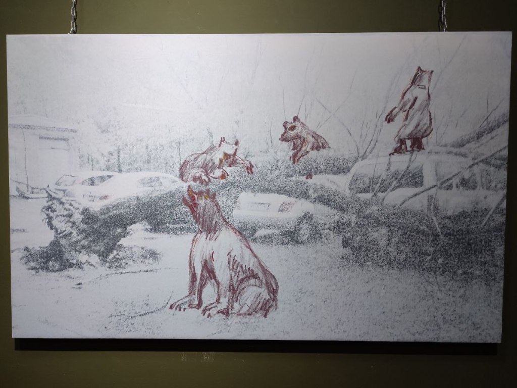 Центральной экспозицией на выставке стали работы Сонаты и Марата Райымкуловых «Бишкек готический». Монстры, поглощающие город, и упыри, пьющие кровь кыргызстнцев, не только пугают, но и наталкивают на определенные мысли.