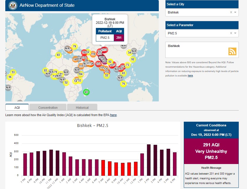 Посольство США в Кыргызстане также установило станцию. Информация обновляется каждый час. Индекс качества воздуха в районе дипломатической миссии «очень нездоровый» — 291 (AQI).