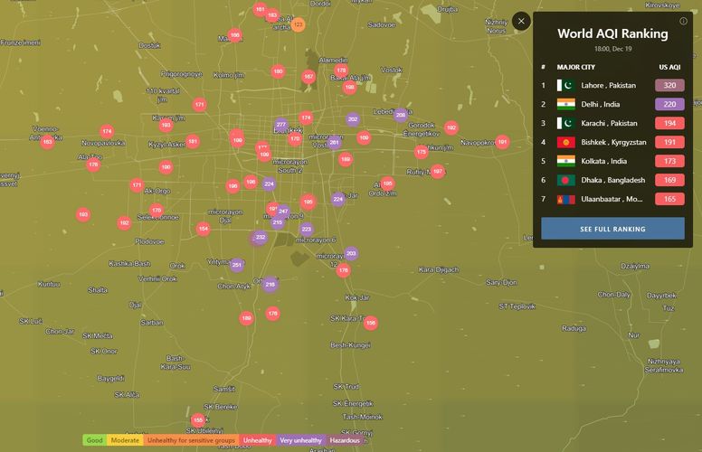 В 18.00 статус города отмечен как «нездоровый». Индекс качества воздуха, по данным сайта, составляет 191 (AQI).
