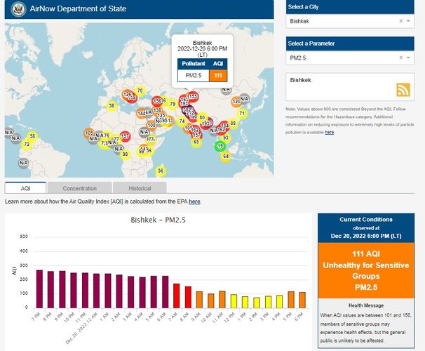 Посольство США в Кыргызстане также установило станцию. Информация обновляется каждый час. Индекс качества воздуха в районе дипломатической миссии «нездоровый для чувствительных групп» — 111 (AQI).