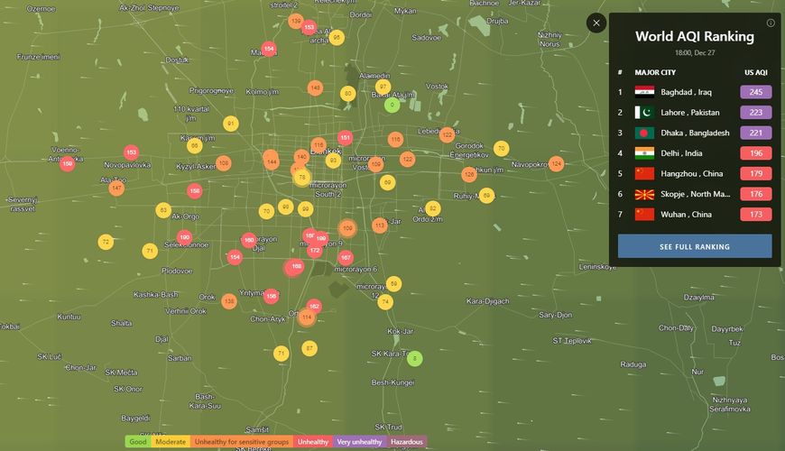 В рейтинге крупнейших городов мира по качеству воздуха World Air Quality Бишкек опустился на 23-е место.