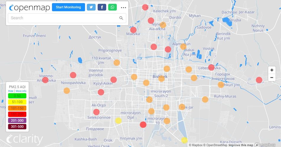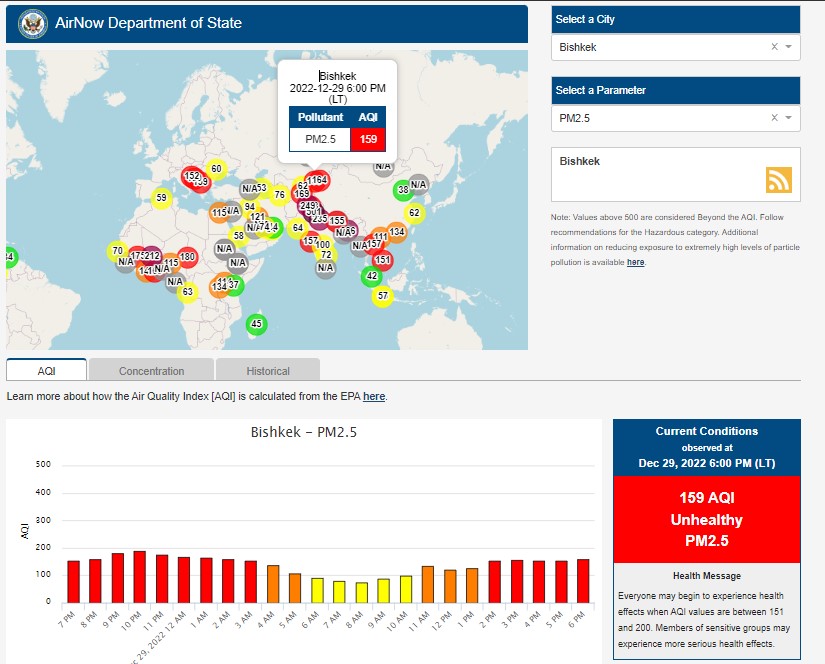Посольство США в Кыргызстане также установило станцию. Информация обновляется каждый час. Индекс качества воздуха в районе дипломатической миссии «нездоровый» — 159 (AQI).