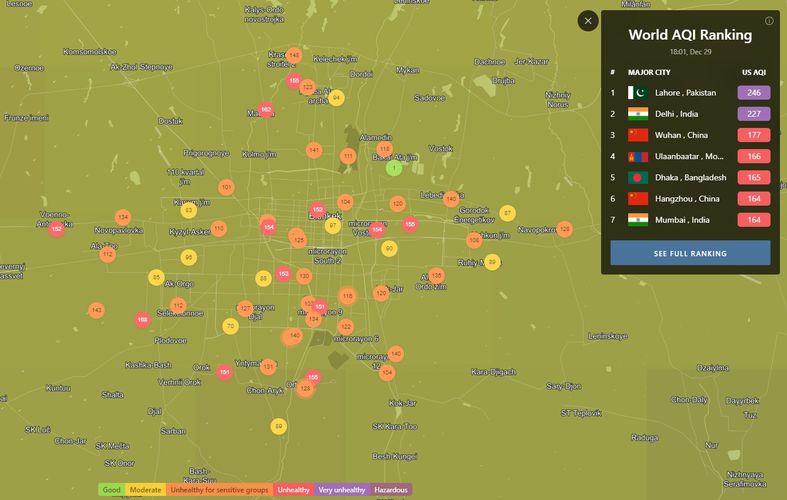 В 18.00 статус города отмечен как «нездоровый для чувствительных групп». Индекс качества воздуха, по данным сайта, составляет 125 (AQI).
