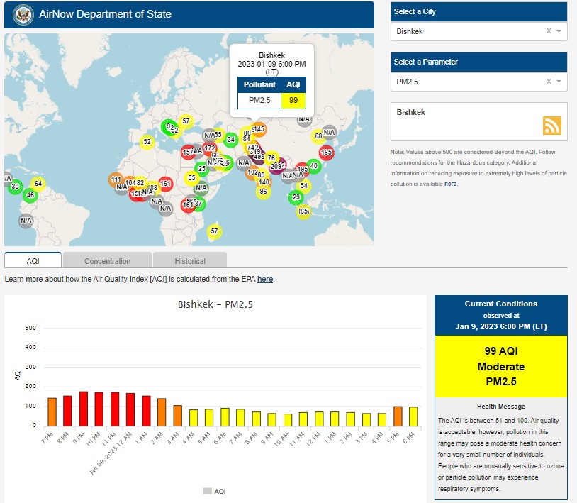 Посольство США в Кыргызстане также установило станцию. Информация обновляется каждый час. Индекс качества воздуха в районе дипломатической миссии «умеренный» — 99 (AQI).