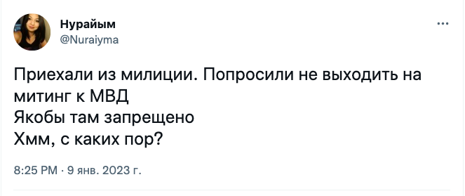 Комментируя ситуацию 24-kg.com, она уточнила, что к ним домой пришли четверо милиционеров и попросили к зданию МВД не выходить, а собраться где-нибудь в другом месте. «Я в это время давала интервью. К ним вышли родители. Вот их попросили. А так приехали меня забрать, оказывается», — добавила Нурайым Сыдыгалиева.