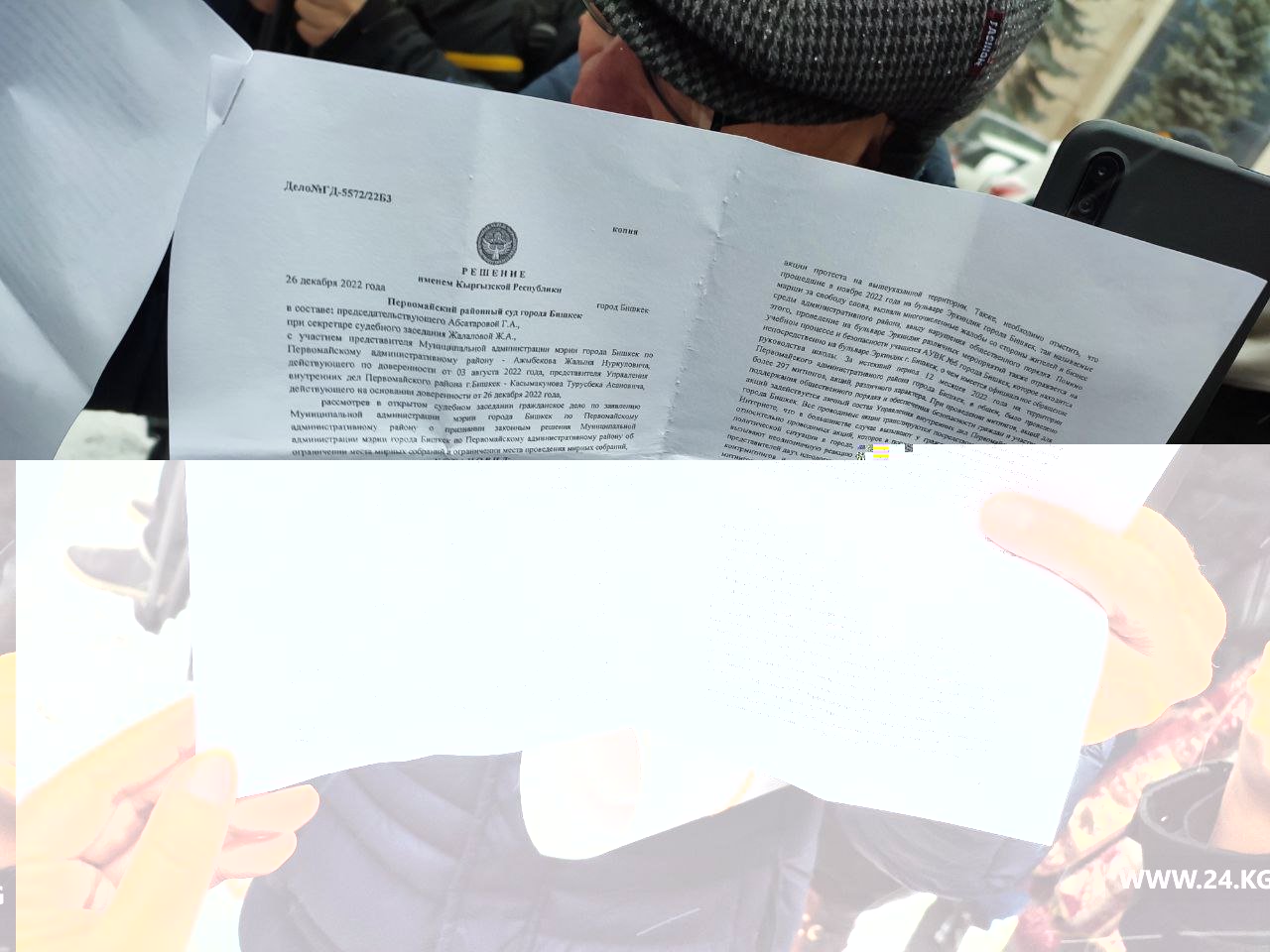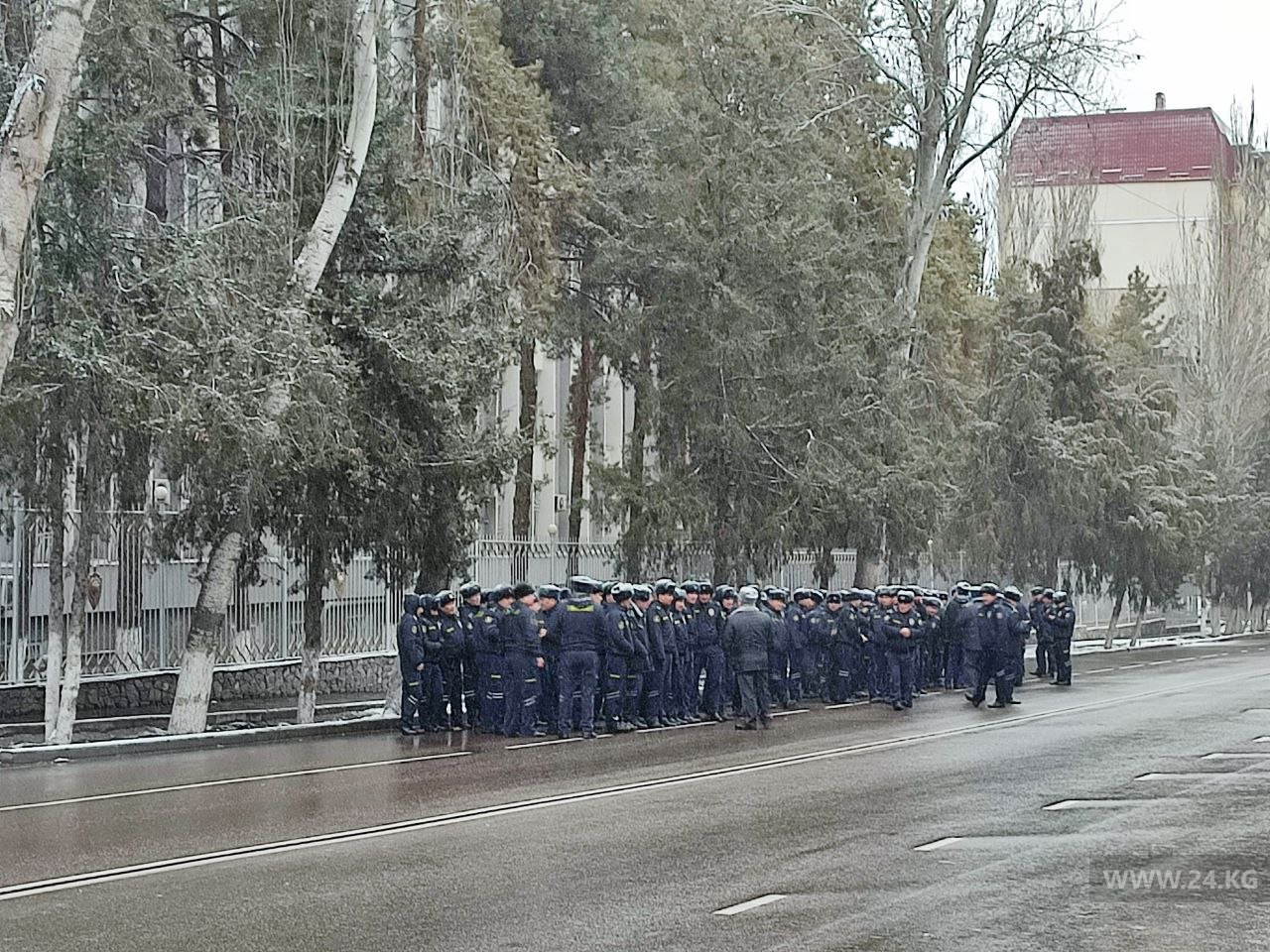 Представители МВД вышли к собравшимся и сообщили о запрете массовых собраний в центре столицы. Такое решение 26 декабря принято Первомайским районным судом Бишкека. Запрет продлится до 31 марта.