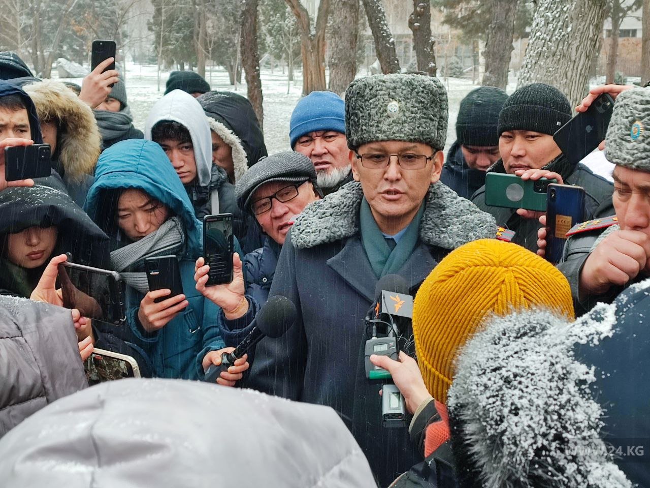 В Бишкеке продолжается акция в поддержку активистов и политиков, содержащихся под стражей по делу об организации массовых беспорядков. К ее участникам, собравшимся у здания МВД, вышел замначальника следственной службы Сапар Аманкулов.