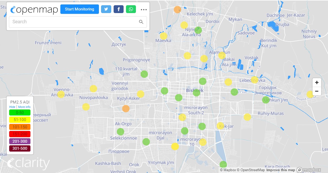 Посольство США в Кыргызстане также установило станцию. Информация обновляется каждый час. Индекс качества воздуха в районе дипломатической миссии «умеренный» — 87 (AQI).