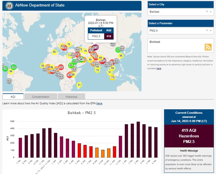 Посольство США в Кыргызстане также установило станцию. Информация обновляется каждый час. Индекс качества воздуха в районе дипломатической миссии «опасный» — 419 (AQI).