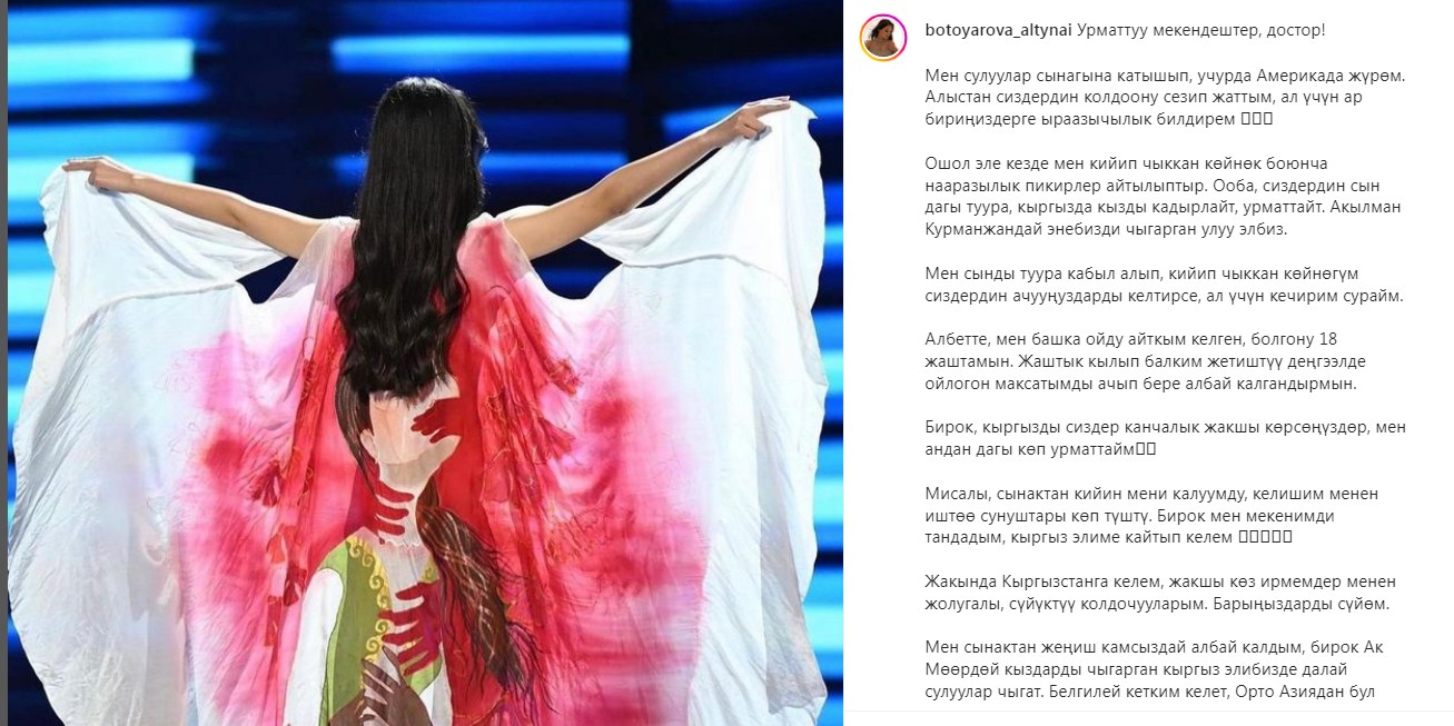 «Да, ваше замечание о том, что кыргызы уважают и почитают девушек. Из нашего народа вышла замечательная Курманджан [датка]... Если платье, в котором я вышла, вас как-то задело, прошу прощения. Конечно, я хотела сказать другое, мне всего 18 лет. Возможно, из-за молодости я немного по-другому преподнесла свои мысли. Во время участия в конкурсе мне поступили предложения о работе за границей, но я выбрала свою родину и вернусь домой», — написала Алтынай Ботоярова.