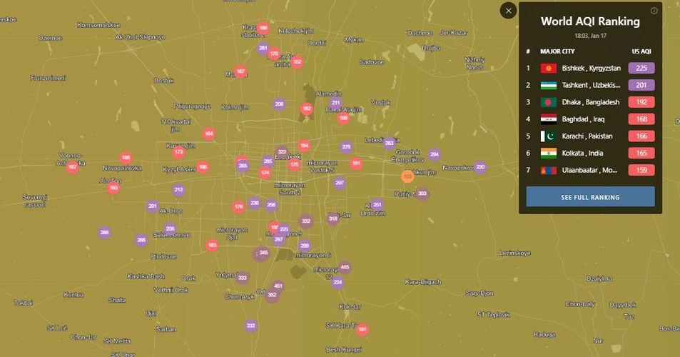 В рейтинге крупнейших городов мира по качеству воздуха World Air Quality Бишкек вновь занял первое место.