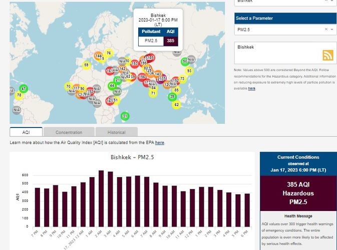 Посольство США в Кыргызстане также установило станцию. Информация обновляется каждый час. Индекс качества воздуха в районе дипломатической миссии «опасный» — 385 (AQI).