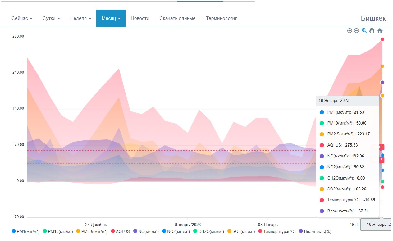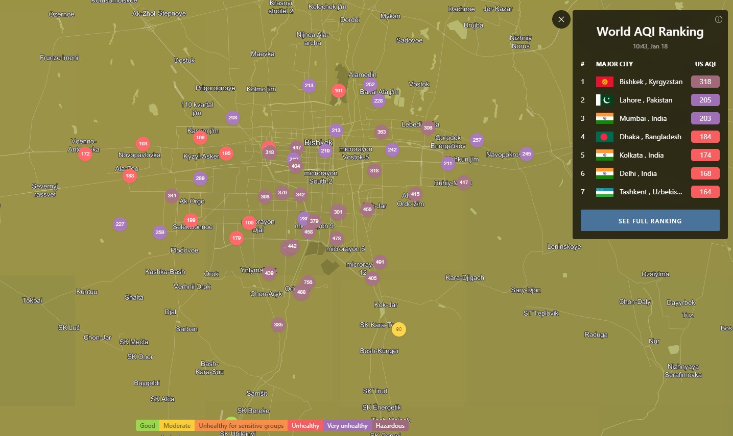 Бишкек вновь возглавил мировой рейтинг по качеству воздуха World Air Quality. Индекс качества не опускается ниже «очень нездорового».