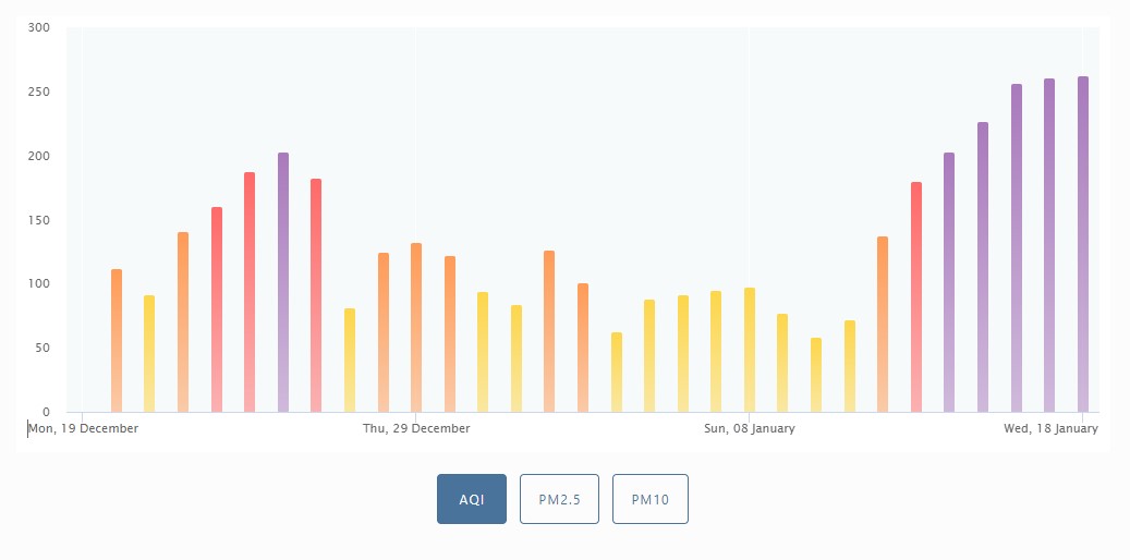 На 15.00 статус города отмечен как «опасный». Индекс качества воздуха, по данным сайта, составляет 318 (AQI). Данные Гидрометеорологической службы также показывают рост уровня загрязнения с 13 января.
