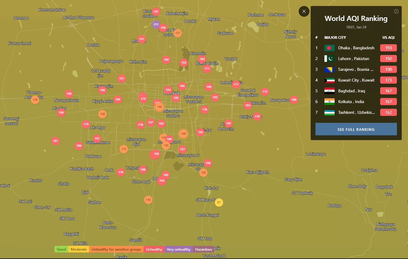 В рейтинге крупнейших городов мира по качеству воздуха World Air Quality Бишкек опустился на 11-е место.