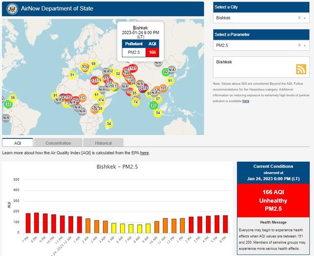 Посольство США в Кыргызстане также установило станцию. Информация обновляется каждый час. Индекс качества воздуха в районе дипломатической миссии «нездоровый» — 166 (AQI).
