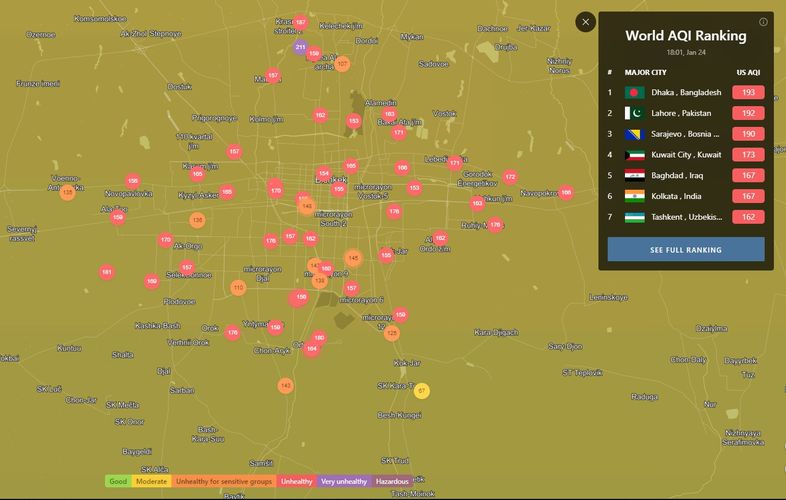 В 18.00 статус города отмечен как «нездоровый». Индекс качества воздуха, по данным сайта, составляет 157 (AQI).