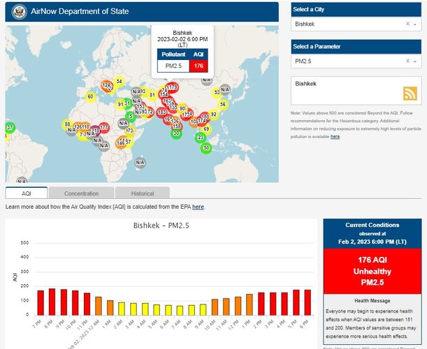 Посольство США в Кыргызстане также установило станцию. Информация обновляется каждый час. Индекс качества воздуха в районе дипломатической миссии «нездоровый» — 176 (AQI).