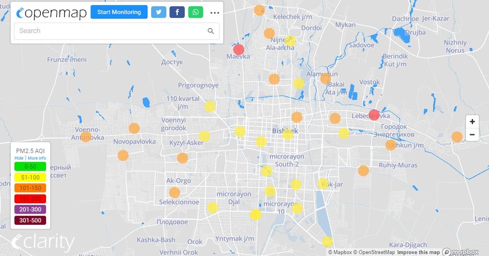 Посольство США в Кыргызстане также установило станцию. Информация обновляется каждый час. Индекс качества воздуха в районе дипломатической миссии «нездоровый для чувствительных групп» — 118 (AQI).