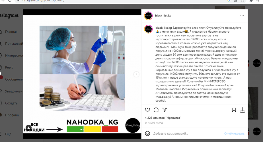 Отметим, в группе black_list.kg в Instagram появилась жалоба на низкую зарплату у медсестер Национального госпиталя.