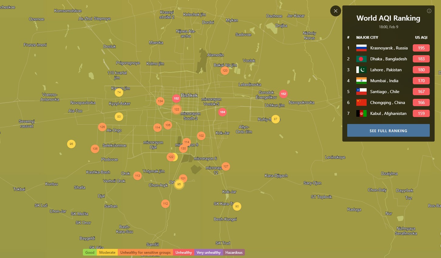 В рейтинге крупнейших городов мира по качеству воздуха World Air Quality Бишкек опустился на 18-е место.
