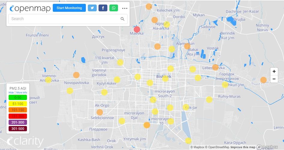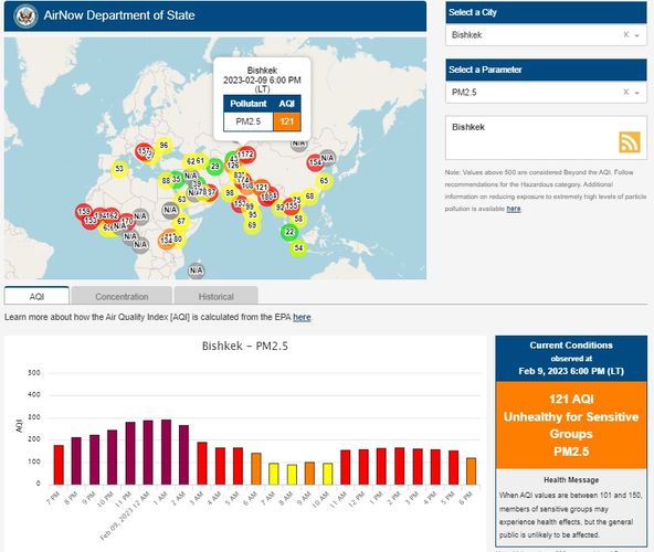Посольство США в Кыргызстане также установило станцию. Информация обновляется каждый час. Индекс качества воздуха в районе дипломатической миссии «нездоровый для чувствительных групп» — 121 (AQI).