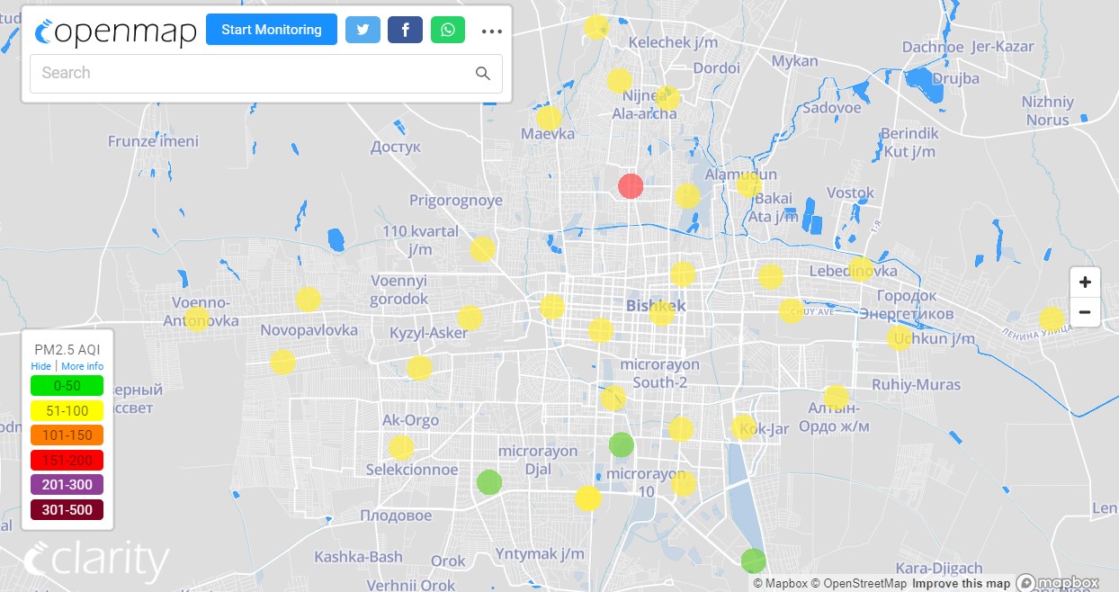 Посольство США в Кыргызстане также установило станцию. Информация обновляется каждый час. Индекс качества воздуха в районе дипломатической миссии «умеренный» — 80 (AQI).