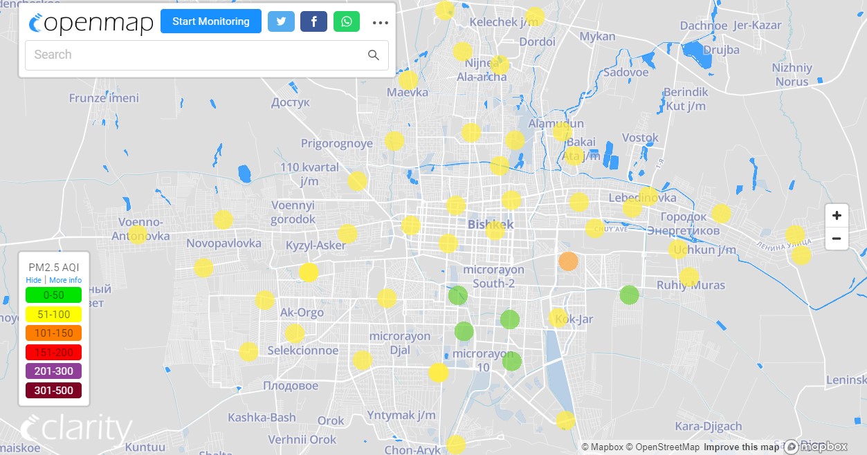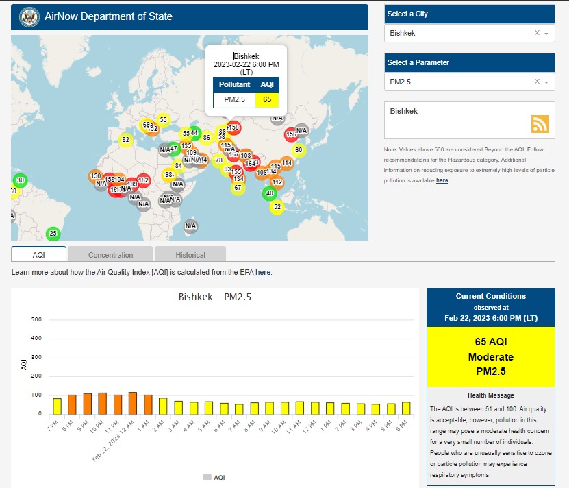 Посольство США в Кыргызстане также установило станцию. Информация обновляется каждый час. Индекс качества воздуха в районе дипломатической миссии «умеренный» — 65 (AQI).