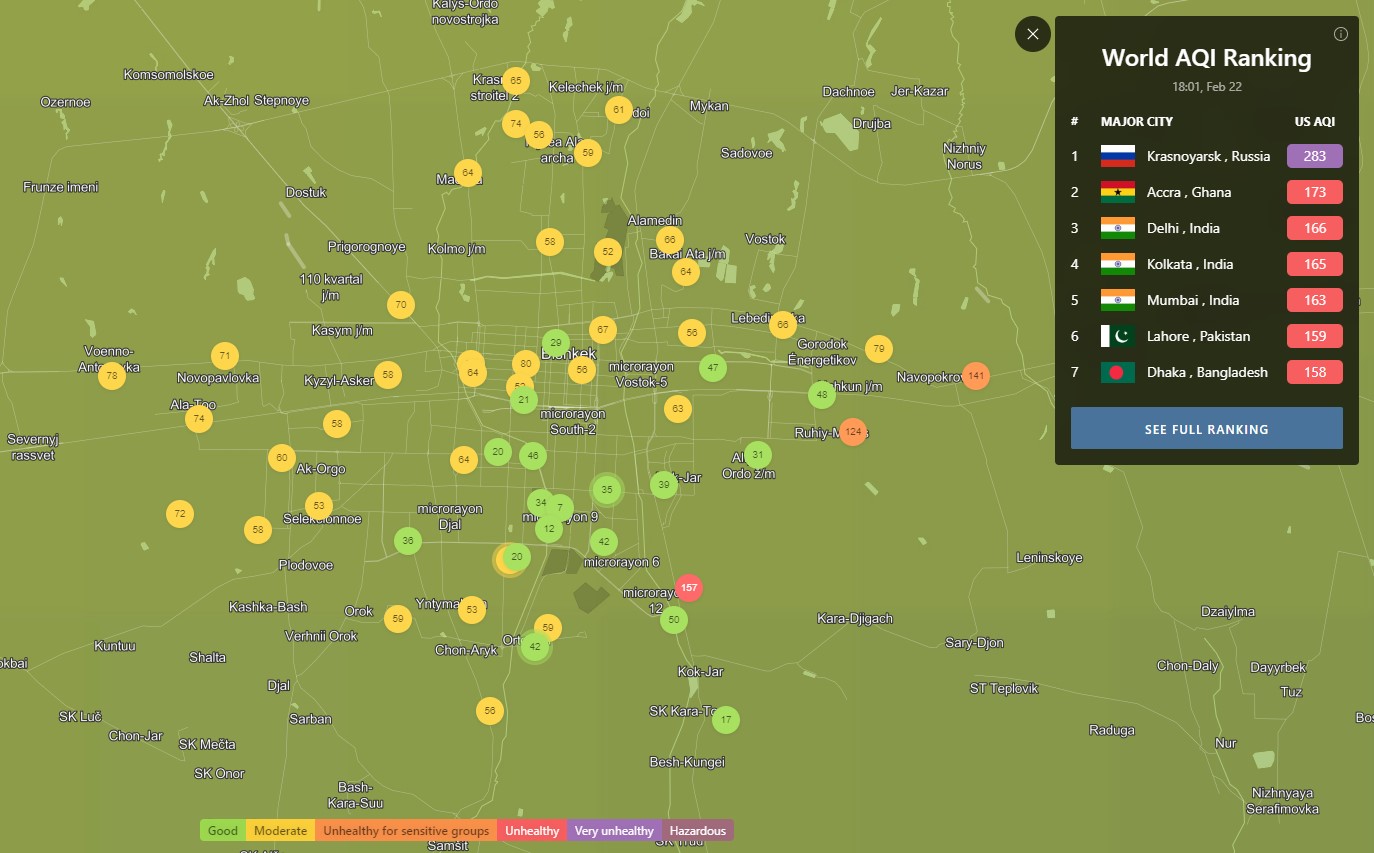 В рейтинге крупнейших городов мира по качеству воздуха World Air Quality Бишкек опустился на 57-е место.